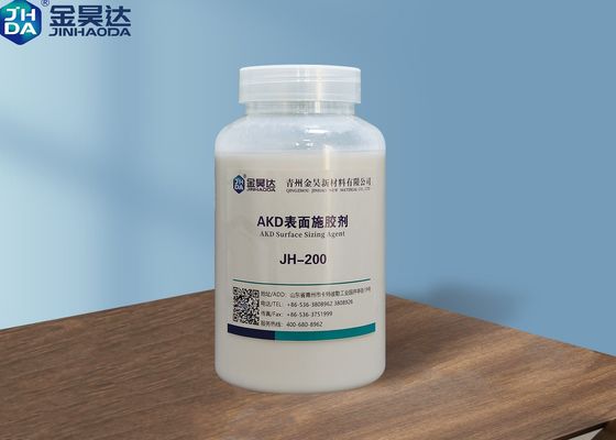 Với sự phát triển của ngành công nghiệp giấy, phương pháp kết dính truyền thống bao gồm cả kết dính bên trong và bề mặt sẽ được thay thế bằng kết dính bề mặt. JH-AKD200 được phát triển thông qua những nỗ lực nhiều năm của chúng tôi. Nó được đồng trùng hợp bằng nhũ tương polyme và các loại nguyên liệu thô cation thông qua quy trình đặc biệt. Nó có thể thay thế hoàn toàn chất kết dính bên trong, giảm đáng kể chi phí kết dính, rút ngắn thời gian hồ hóa, tăng độ bền bề mặt giấy và có khả năng chống thấm nước tốt hơn. Nó được sử dụng rộng rãi trong sản xuất giấy văn hóa, giấy sóng có độ bền cao, giấy bìa và v.v. với bột gỗ, bột rơm, bột tre và bột thải